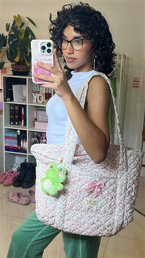 The quilted exterior and interior both feature the same charming leopard print, creating a seamless look throughout.
